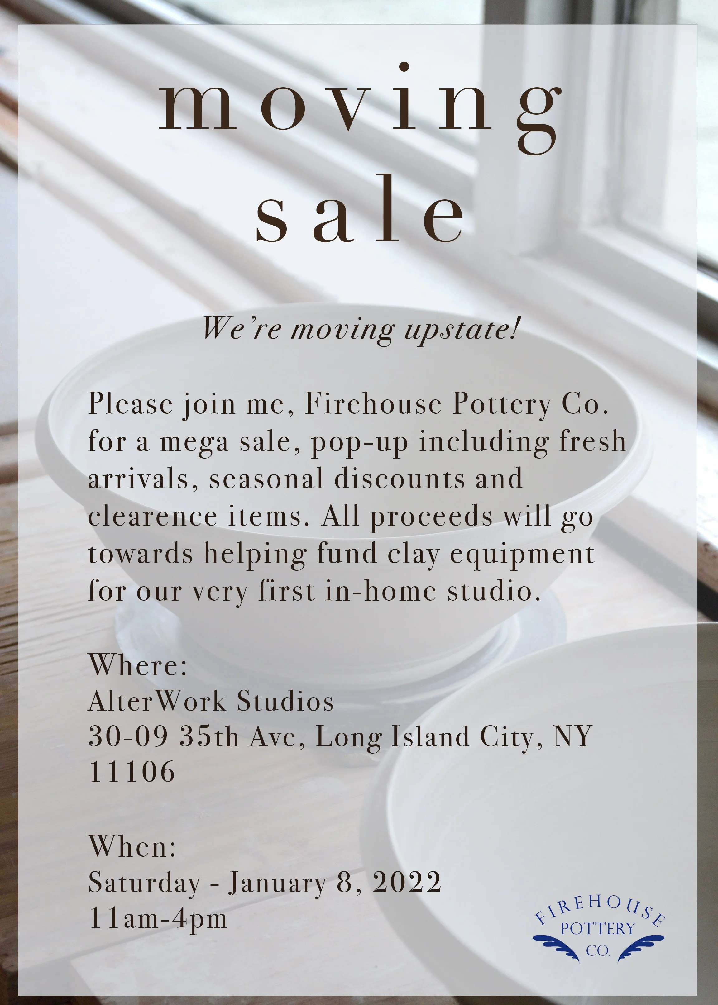 Please join the artist for a mega sale, pop-up including fresh arrivals, seasonal discounts, and clearance items. All proceeds will go toward helping fund clay equipment for Firehouse Pottery Co.’s very first in-home studio.