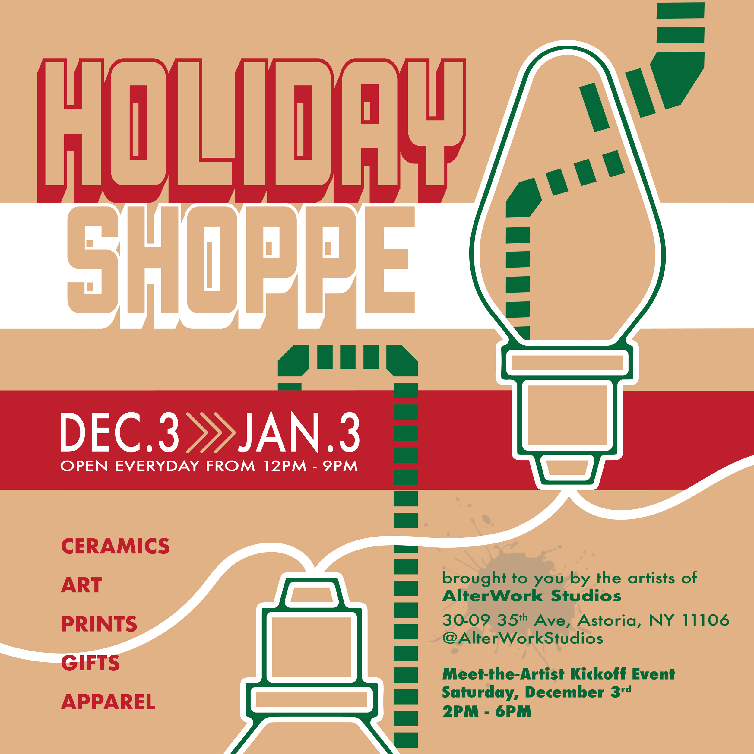 Stop in to shop a wide range of art, ceramics, prints, gifts, apparel, and much more. The Holiday Shoppe will be open every day from 12-9 pm until January 3, 2023. The Shoppe will not be open: Dec. 23 - 25 and Dec. 31 - Jan. 1.